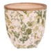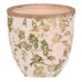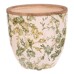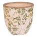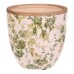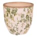 This medium-sized ceramic plant pot cover features a delicate retro pattern of green flowers on a light beige background. Its rounded shape and slightly wavy rim are accented by a natural brown shade on the top edge, enhancing the overall design. The surface is glazed with subtle crackling that adds an authentic vintage effect. Suitable for various types of plants, the ceramic material is easy to maintain and provides stable support for the flowerpot.