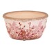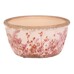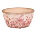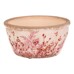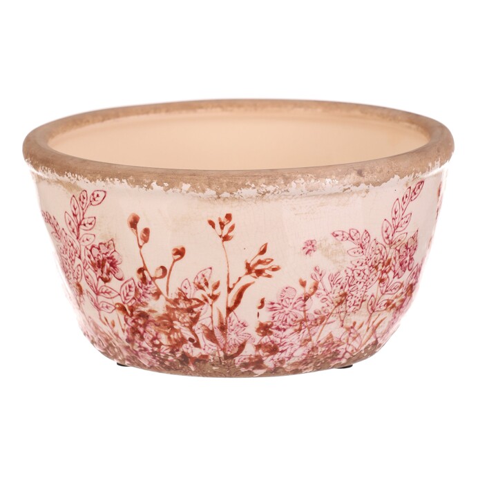 This round ceramic bowl in a retro style features a delicate pattern of pink flowers on a light background with a distressed rim that adds an authentic touch. The bowl is suitable for decorative use as well as a practical cover for flower pots or small items. Its sturdy ceramic design ensures stability and easy maintenance. With its natural tones and floral motif, it complements rustic interiors and garden corners alike.