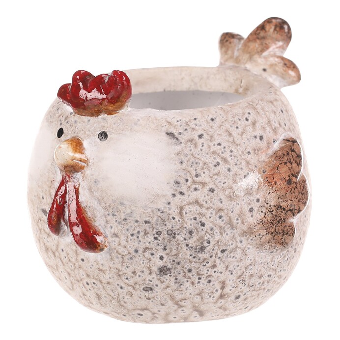 This ceramic flower pot shaped like a hen in a cream color adds a playful and natural touch to any interior. Its rounded body with a subtle texture and detailed features such as the comb and beak create a decorative accent suitable for small plants. The glazed surface ensures easy maintenance and resistance to everyday wear. Its compact size S makes it ideal for placement on windowsills, shelves, or desks.