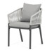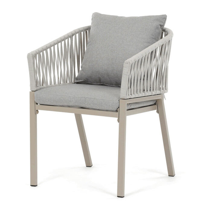 The garden chair in beige features a stable metal base combined with a comfortable seat and backrest upholstered in fabric with a pleasant shade. Its timeless design with delicate lines and an open backrest structure creates an airy look suitable for various outdoor settings. Designed to provide comfort for seating on terraces, gardens, or balconies, the sturdy metal base ensures long-lasting stability and resistance to weather conditions. The fabric cover is soft to the touch and easy to maintain, enhancing practical use outdoors. The overall design supports comfortable ergonomics and allows relaxation in a natural environment.