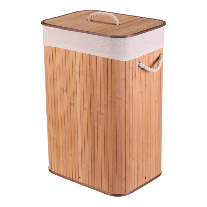 The laundry basket made of bamboo in a natural shade offers a practical and aesthetic solution for storing laundry. Its body consists of thin bamboo slats that provide strength while maintaining lightness. The top lid features a sturdy handle made of natural rope, as do the side handles, facilitating easy handling and carrying. Suitable for bathrooms and bedrooms, the basket contributes to a pleasant atmosphere with its natural appearance. Compact dimensions allow for easy placement even in smaller spaces.