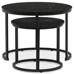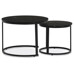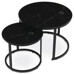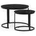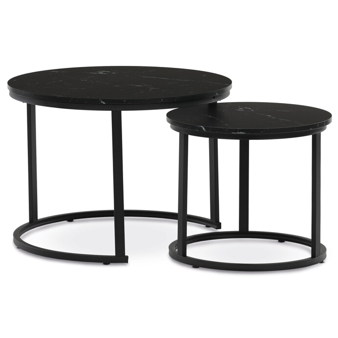 A set of two coffee tables featuring MDF tops with a black marble decor and matte finish offers a modern solution for living rooms or offices. The metal base in black lacquer provides sturdy and stable support, while the round shape of the tables contributes to an elegant and airy appearance. The larger table stands 50 cm tall, with the smaller one slightly lower, allowing practical nesting and flexible space arrangement. The combination of quality materials and precise craftsmanship ensures long-lasting durability and easy maintenance. This set suits modern interiors where both functionality and design are valued.