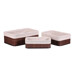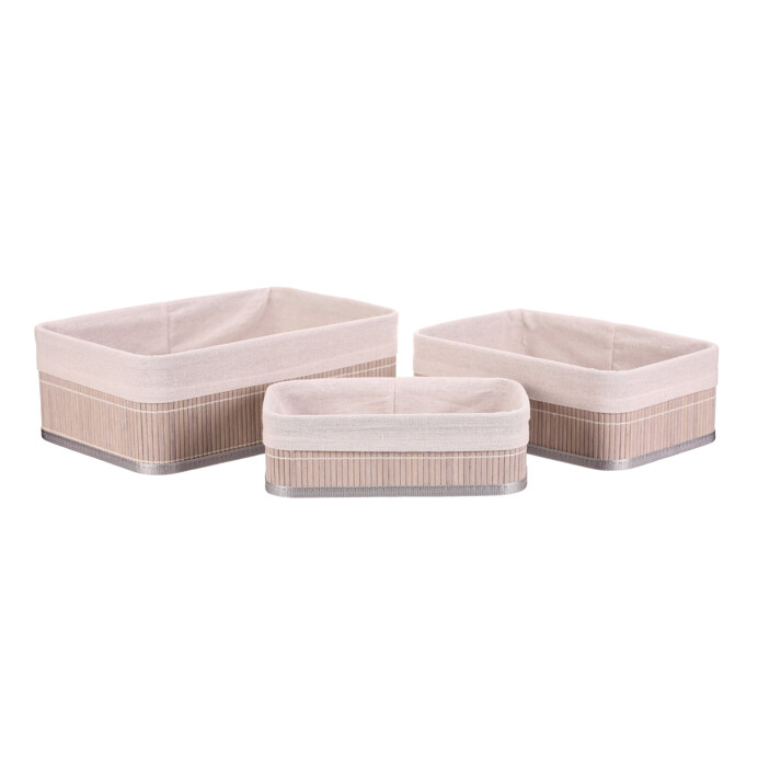 This set of three shelf baskets in grey combines natural bamboo with fabric edging that provides a subtle contrast and a pleasant appearance. The baskets feature sturdy bottoms and walls made of bamboo slats arranged in a regular pattern, contributing to their stability and lightness. The fabric trim at the top facilitates handling and adds a refined design detail. Suitable for organizing small items in shelves, cabinets, or desks, helping to maintain order and clarity. Thanks to the natural material, they are easy to maintain and bring a natural atmosphere to any space.